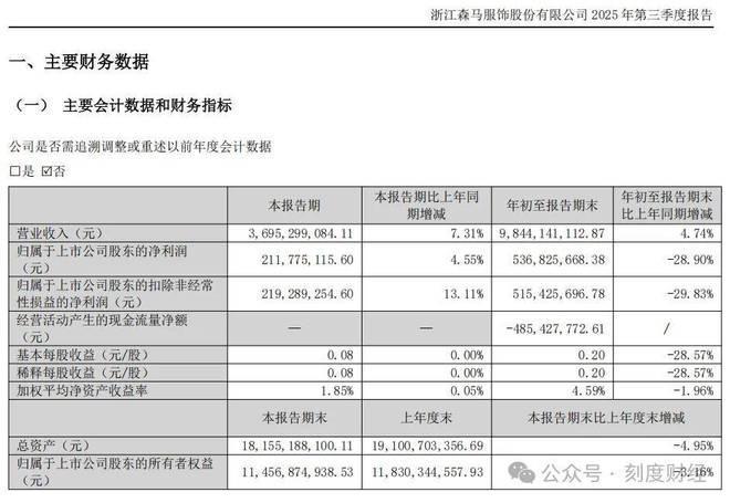 《刻度财经》翻看森马最新披露的2025年第三季度财报,得知森马第三季度实现营业收入为36.95亿元,同比增长7.31%。净利润2.12亿元,同比增加4.55%;扣非净利润为2.19亿元,同比增长13.11%。