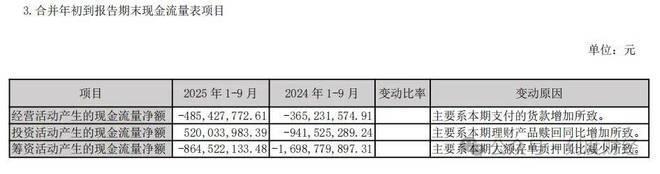 2025年前三季度,公司净利润5.37亿元,同比下降28.9%;扣非后净利润5.15亿元,同比下滑29.83%,核心盈利能力减弱。经营活动产生的现金流量净额为-4.85亿元。